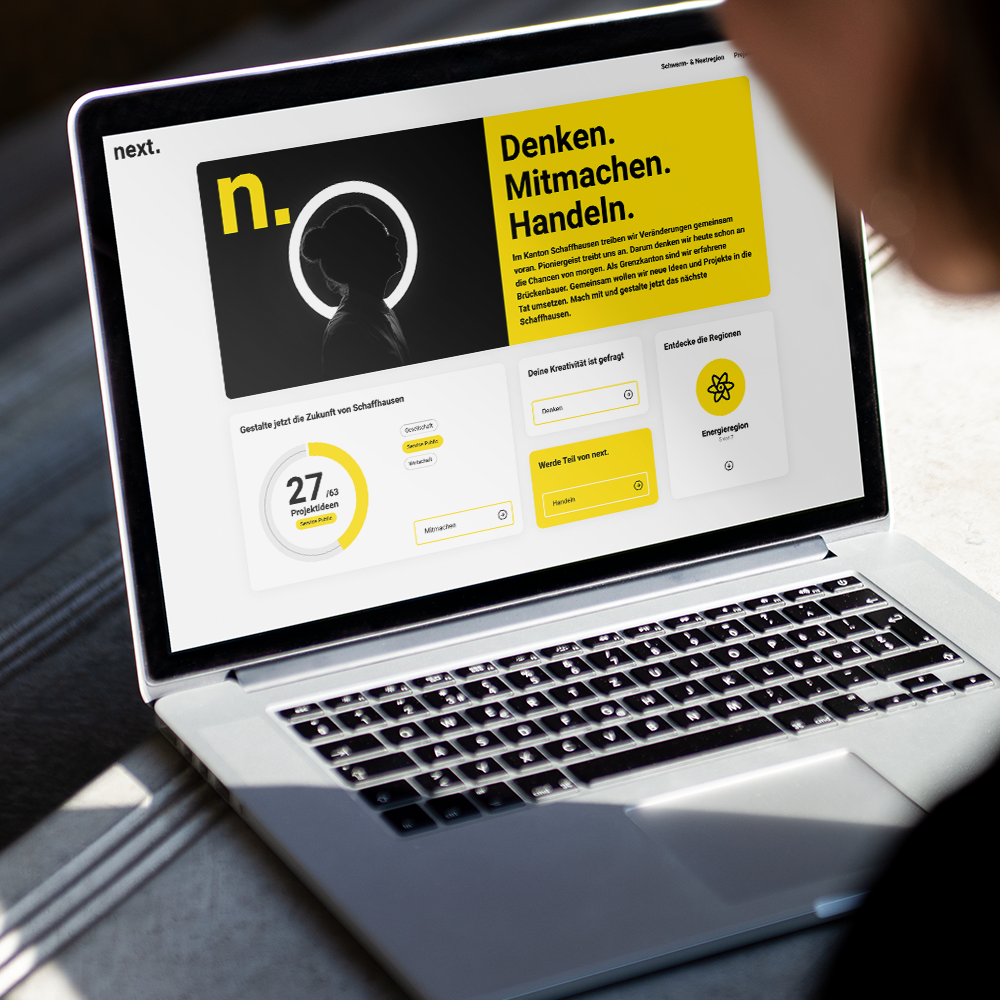 Wie sieht das Schaffhausen von morgen aus? Kanton, Wirtschaft und Bevölkerung haben mit "next" ihr Zukunftsbild, gemeinsame Stossrichtung und über 60 Projektideen für die nächsten 10 Jahre erarbeitet. Wir haben die digitale Bühne für die Entwicklungsstrategie konzipiert und umgesetzt.