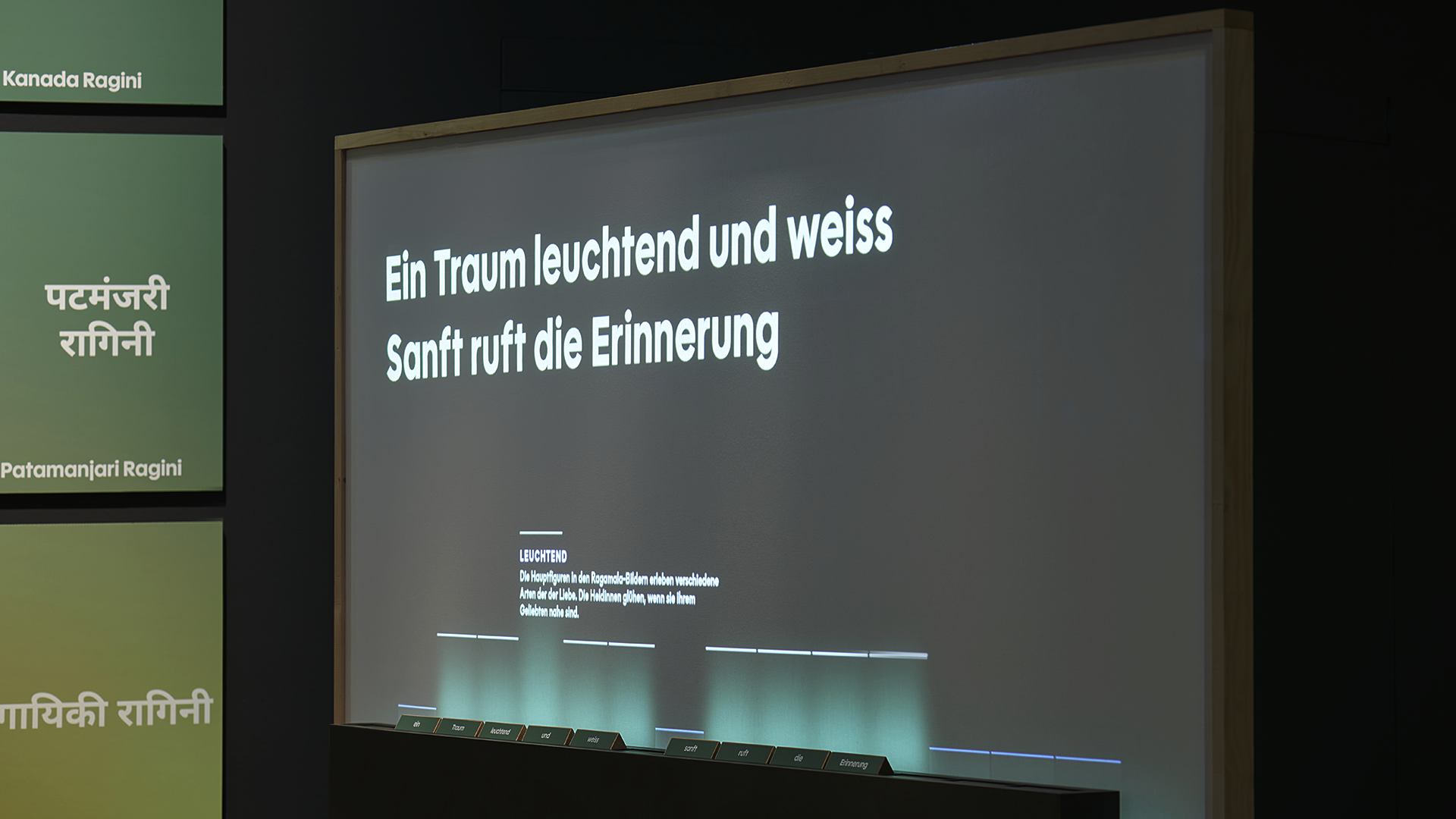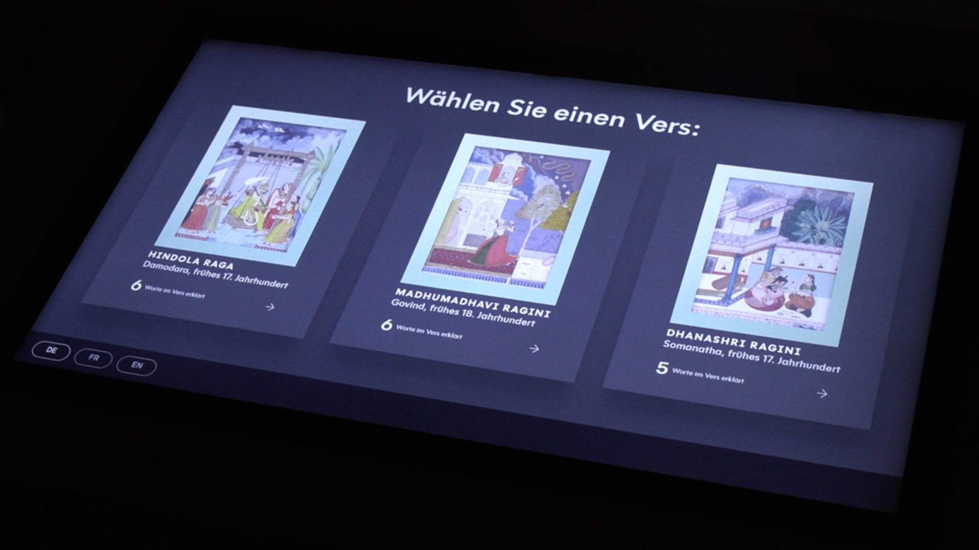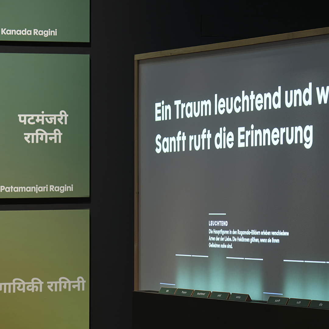 The exhibition at the Museum Rietberg is dedicated to Ragamala, a jewel of Indian miniature painting where music, poetry, and art seamlessly blend. We have been tasked with designing and developing the interactive section of the poetry area. The core mechanism centers on giving visitors the opportunity to play with words and create their own Ragamala poems in an interactive way – whether digitally, physically, or through a combination of both.