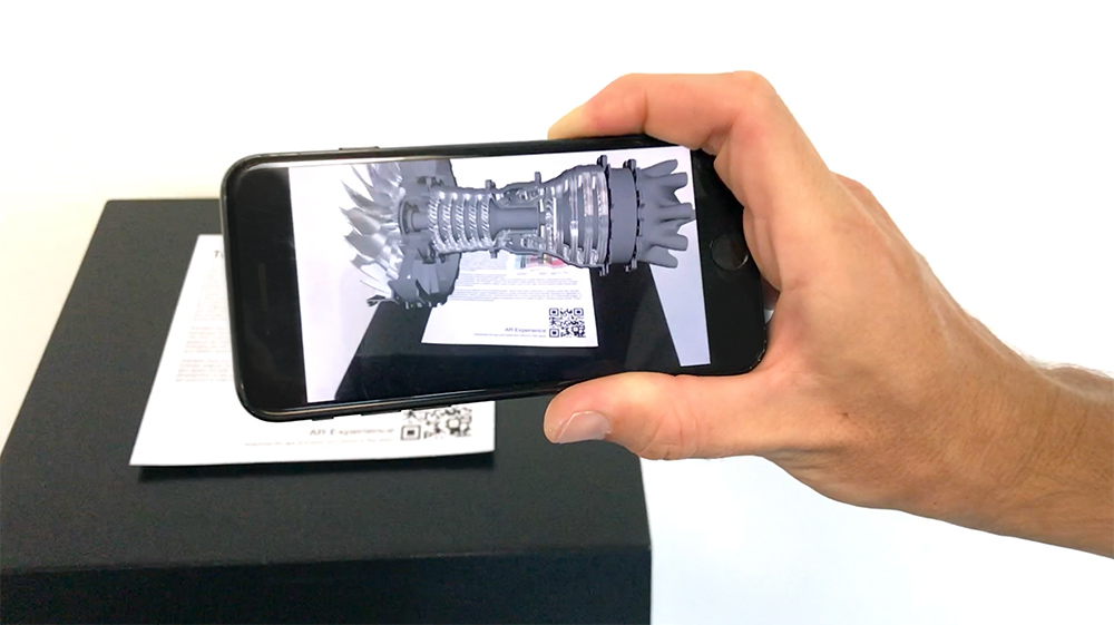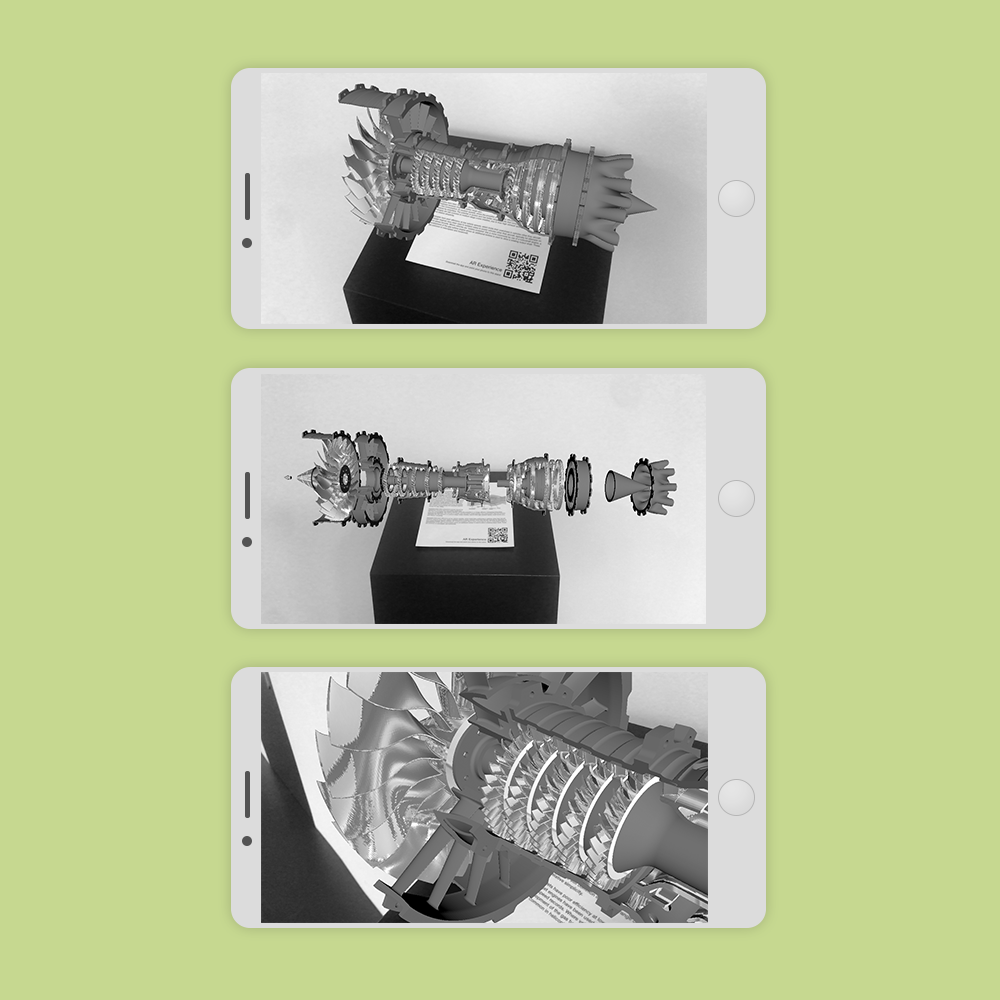 In our continued research into the applications of augmented reality on mobile devices, we've prototyped a display-case concept where a turbojet engine is showcased with all its moving parts. The experience is triggered by a info-plaque, and serves to demonstrate how a simple static informational display can spring to life in the digital world. Such a experience can be extended in endless possibility: info labels, content drill down, video integration, et cetera. One of the amazing features of AR tech on mobile devices is the quality of the tracking, even if the original marker (the plaque) is no longer in view - thanks to the fast graphics processor and the very high definition accelerometer and gyro sensor. This allows for a immersive experience where you can dive into the object displayed and view it from all angles.