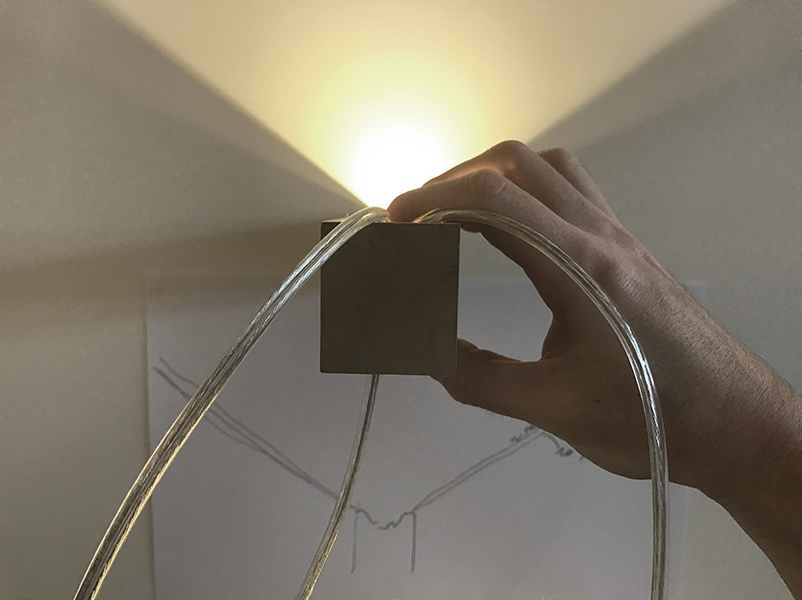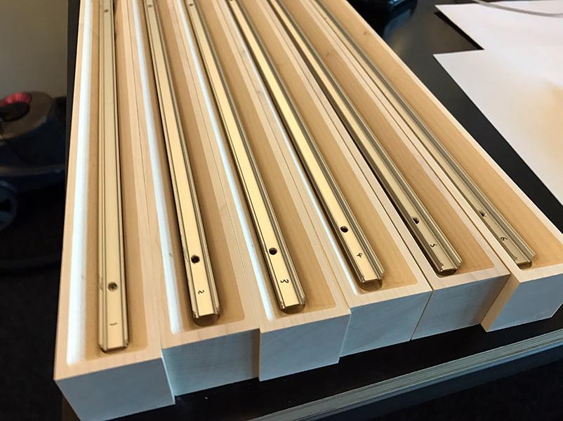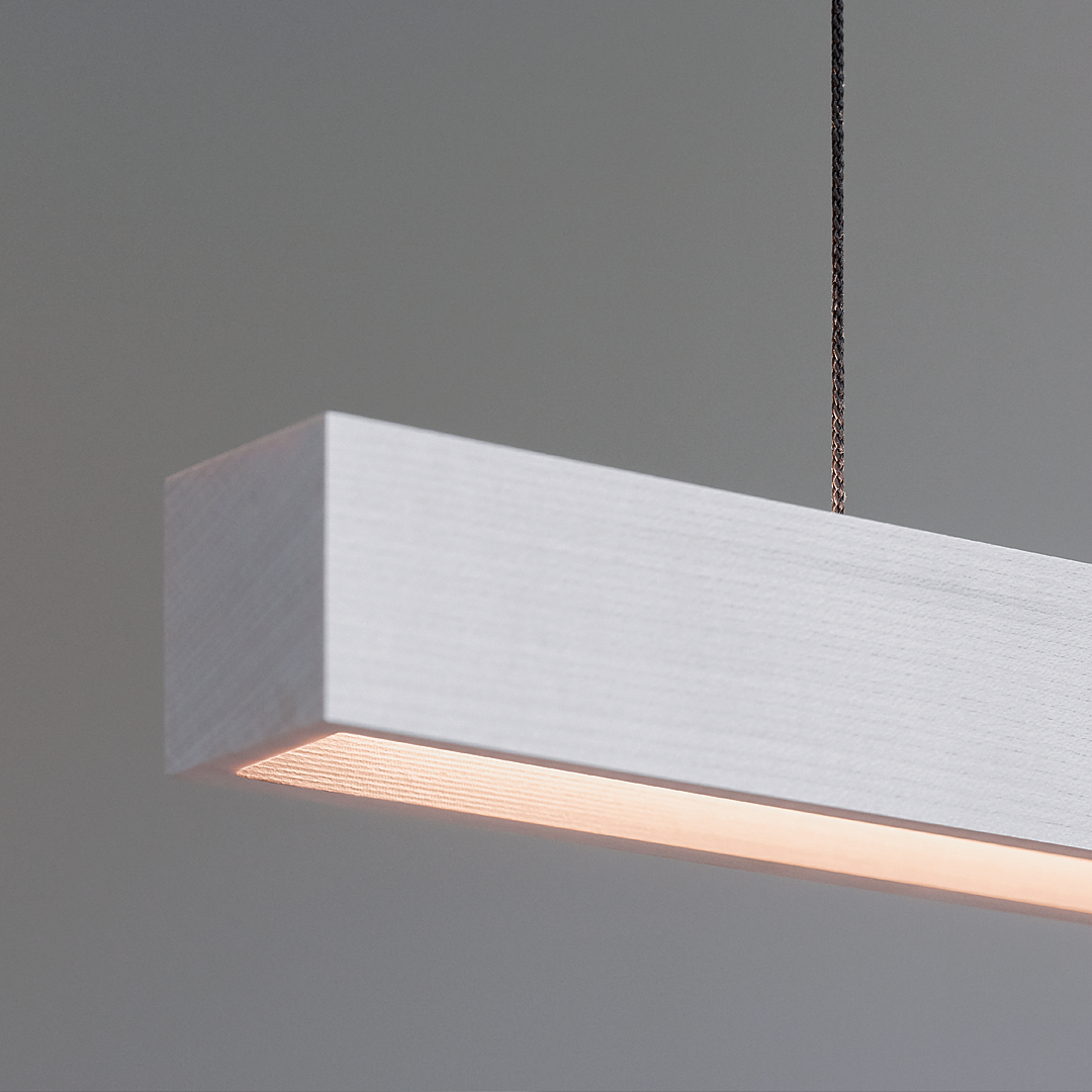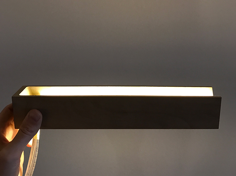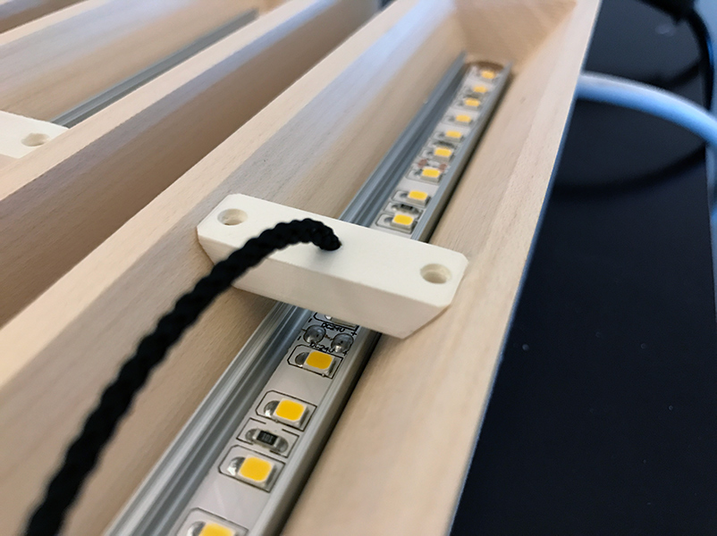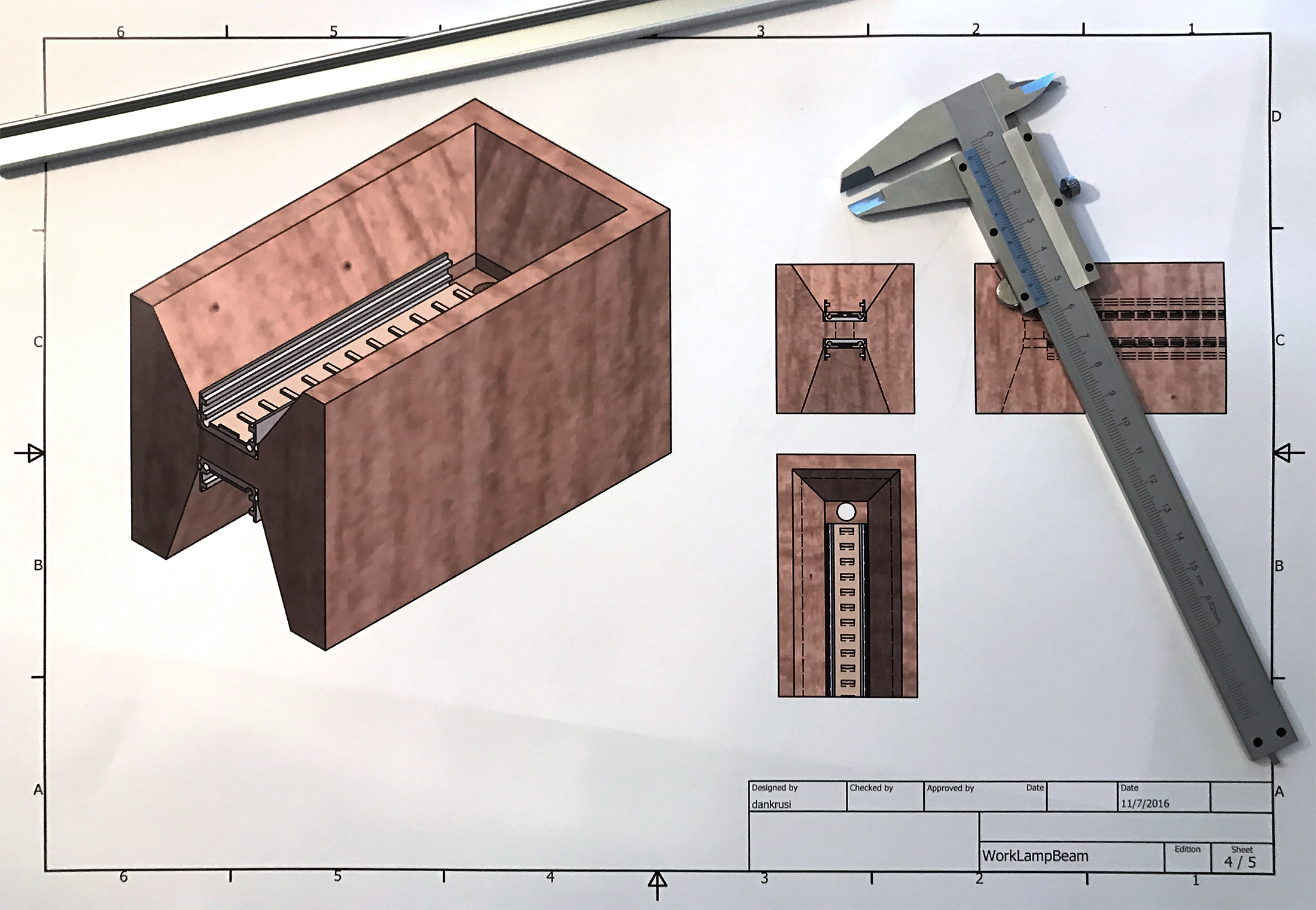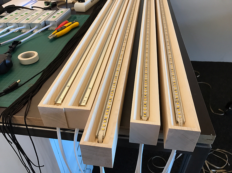 We couldn't find any work lamps that fit our bill of requirements, so we designed and produced our own. High-efficiency warm-white LEDs provide over 5000 lumen per workspace, with separate dimmers for the top and bottom. The process involved prototyping and testing, with the final pieces made up of computer-cut birch wood, 3d printed mounting pieces, and aluminum heat sinks.