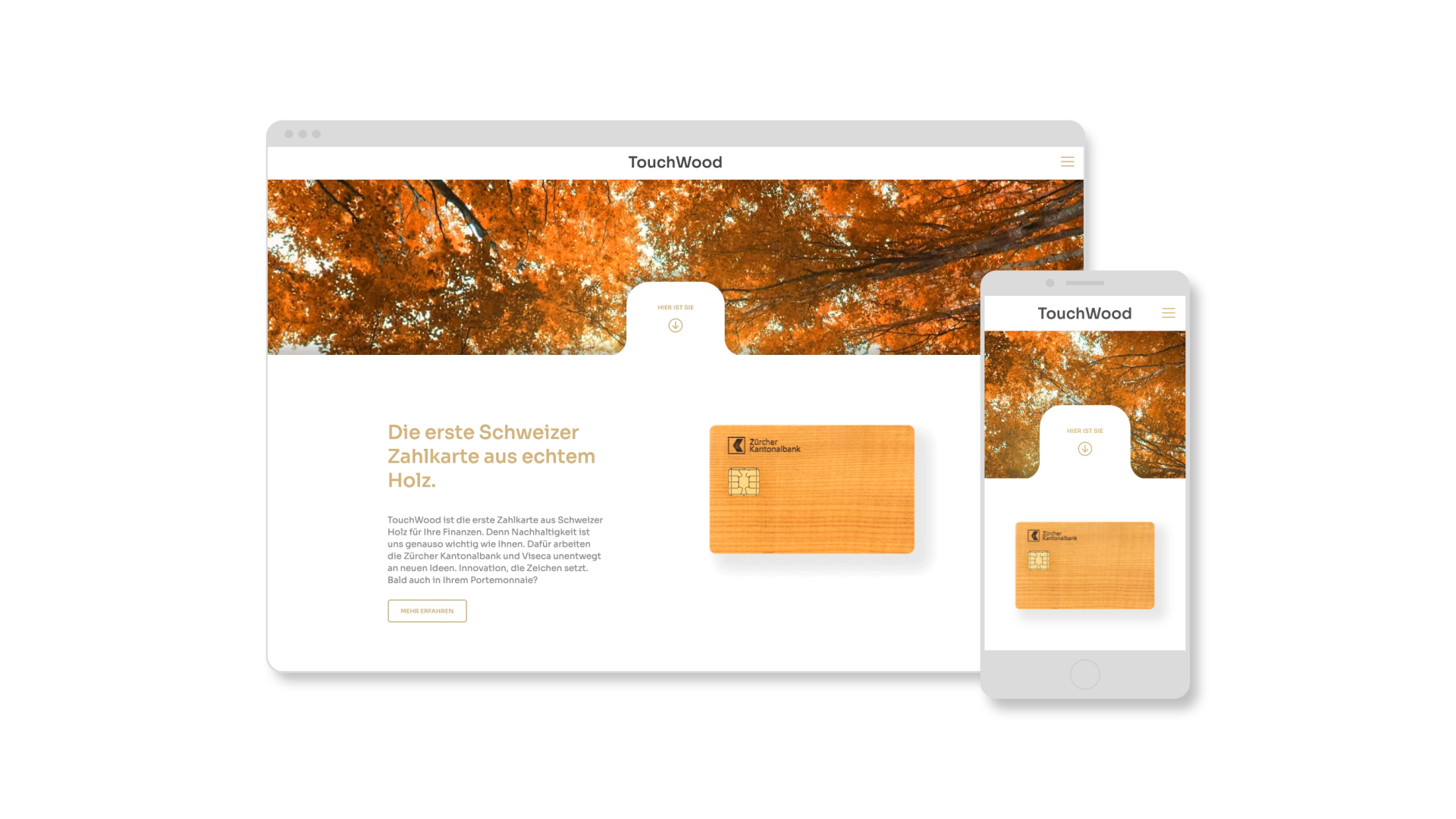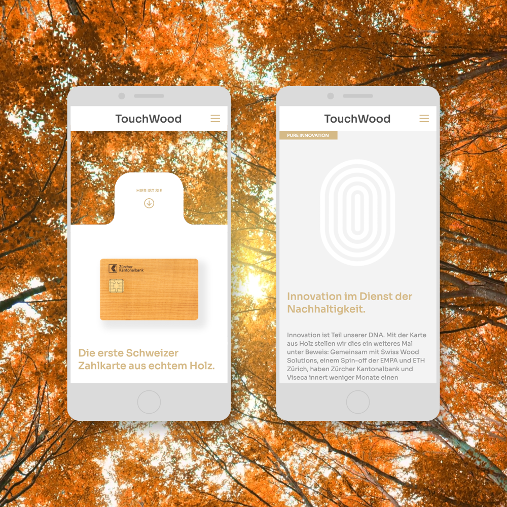 TouchWood — the world's first payment card manufactured from real wood. Made from local woods, with Swiss innovation, for a more sustainable future. A joint project by Zürcher Kantonalbank, Viseca and Swiss Wood Solutions, which sets an example in the area of sustainability.