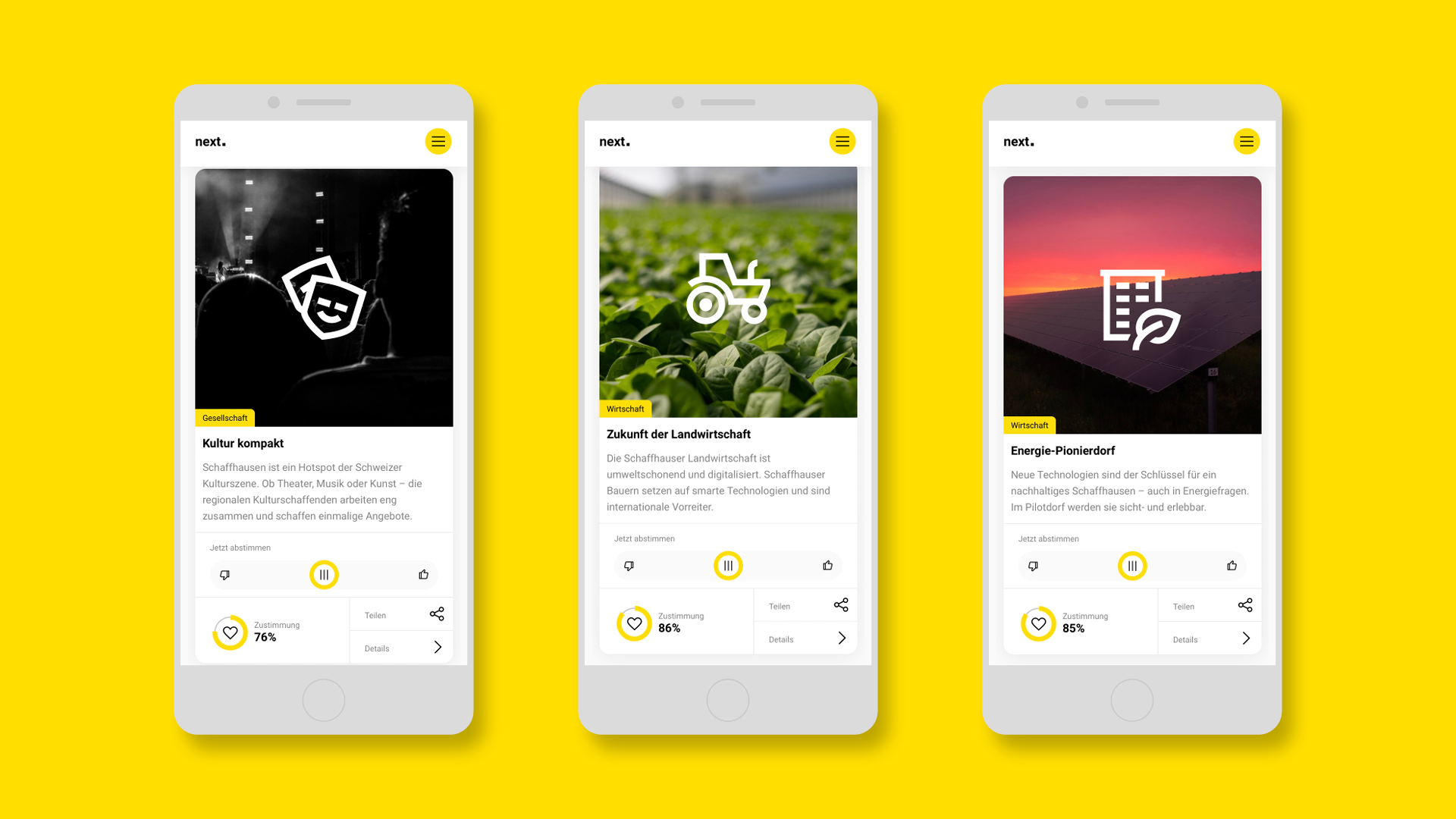 What does Schaffhausen of tomorrow look like? The canton, representatives of the economy and the population have worked out their vision of the future with "next", a common direction and over 60 project ideas for the next 10 years. We designed and implemented the digital platform for the development strategy.